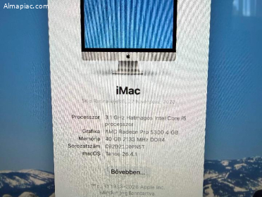 Kiváló és megkimélt műszaki állapotban -Core i5-6 Magos-3.10Ghz _40GB DDR4 bővithető -250GB SSD -AMD Radeon Pro 5300 4GB Grafika -27"Retina 5K kijelző(5120x2880) -macOS Tahoe op.rendszer -Fekete Apple Wireless Billentyűzet és egér